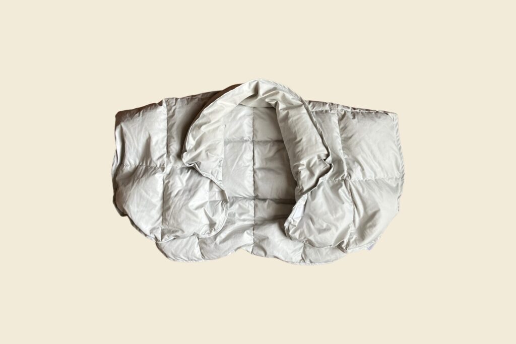 寝る時も、羽毛が軽くて薄いので背中部分がちゃんとつぶれてくれて、邪魔にならないです。