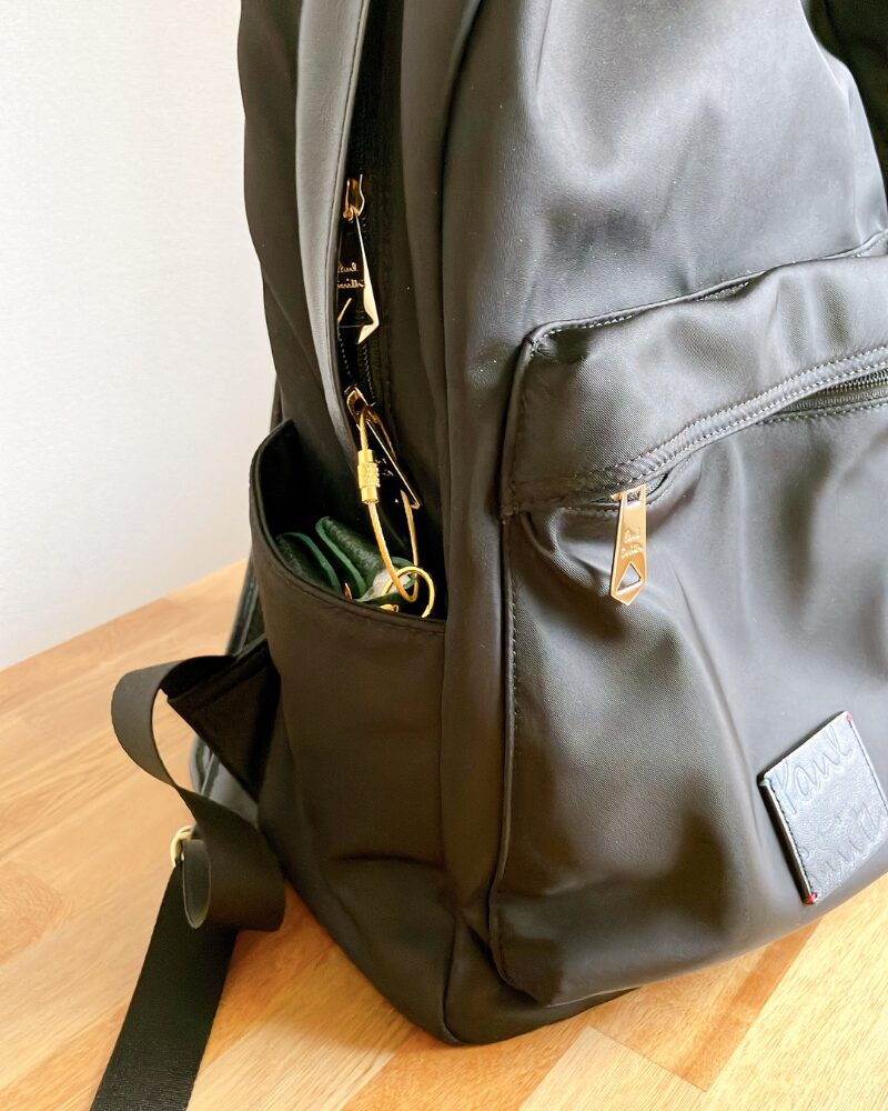 因みに母の場合、ブランドバッグなどは持たないので、いつも使っているリュックサックの脇につけてます。
