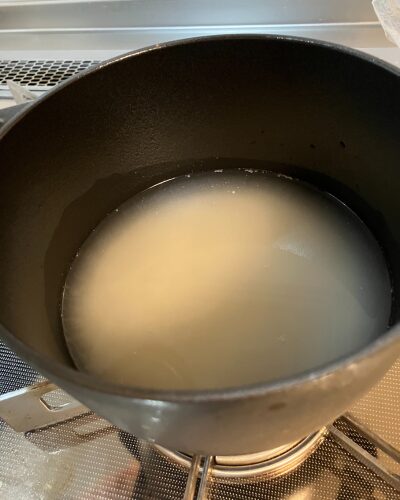 数回繰り返して、水が透明になってきたら、ストウブ鍋にお米を新しいお水をいれます。